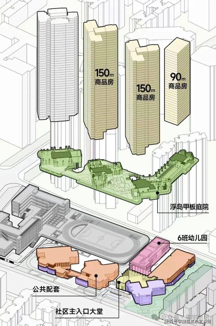 利用裙房屋顶打造拥有“仪式水轴“艺术庭院”“空中浮岛森林”三级景观设计的空中庭院,四栋住宅均漂浮于甲板之上,独享甲板庭院花园,以“海风吹拂下的豪宅底盘”托举城市上空的豪宅群落,形成立体景观系统。