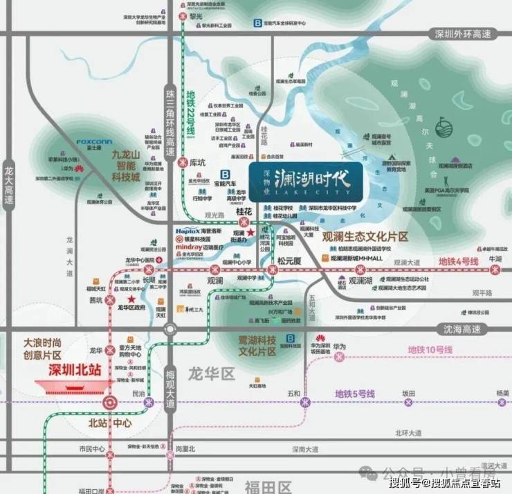 ●片区现有富士康、华润三九、长安标致雪铁龙等龙头企业入驻,华为将拟建76万㎡新能源大厂,迈瑞亦布局建设医疗器械标杆制造基地,观澜成为大湾区产业高地,高净值尖端人才涌入,就近置业需求井喷。