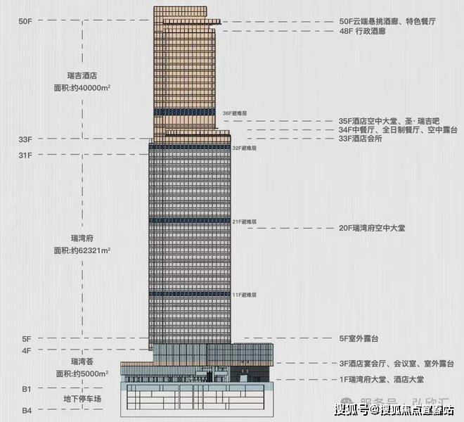 项目总占地约7700㎡,建筑面积约10.7万㎡,其中包含了约4万㎡瑞吉酒店、6.2万㎡企业会馆瑞湾府以及5000㎡瑞湾荟商业,是一个集企业会馆、五星级奢华酒店、精致商业于一体的垂直综合体。