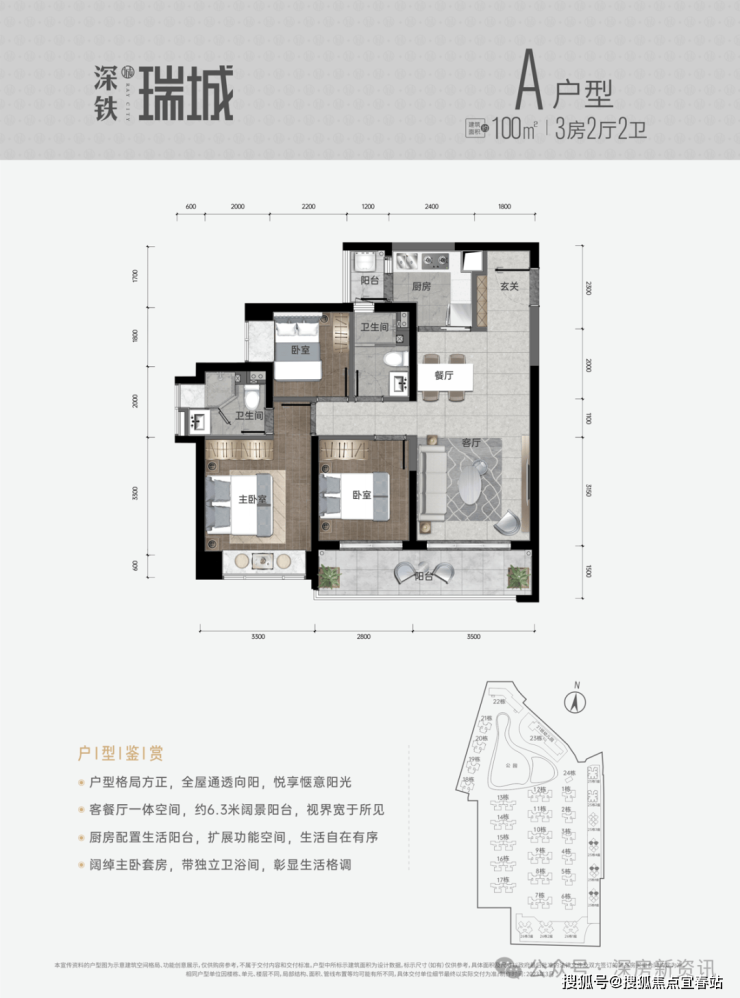 100㎡的3房2厅2卫,A户型,设计的是经典竖厅格局,客厅3.5米开间,3个卧室分别做到了主卧12㎡/次卧7.57㎡/次卧6.01㎡(实测面积,去掉墙体),客厅连接次卧出6.3米长的阳台,厨房还带1个生活阳台,得房率约:75.76%(不含赠送),西南或东南朝向。