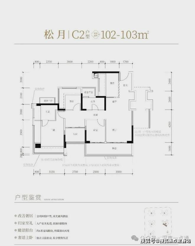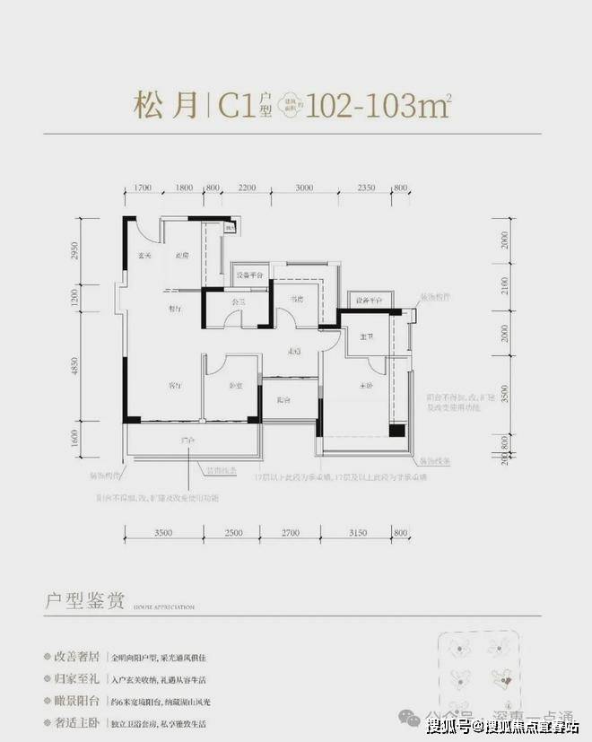 102-103㎡的4房2厅2卫,C1-C2户型,设计的是经典竖厅格局,进门入户玄关,客厅3.5米开间,LDKB一体化,S墙设计预留冰箱卡槽位,动静分区,四开间朝南,4个卧室分别做到了主卧17.98㎡/次卧8.37㎡/次卧8.1m²/次卧7.75㎡(包含墙体飘窗),L型厨房,公卫干湿分离带1个约2m²的设备平台,得房率约81%(不含赠送),客厅连接次卧出9.6m²的观景大阳台,东南或西南朝向。套内面积83.43m²+赠送面积23.86m²=实际使用面积107.29m²,加上赠送后得房率约104.16%。