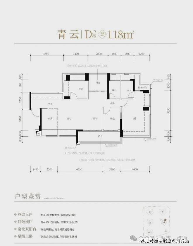 118㎡的4房2厅2卫,设计的是横厅南北通透格局,进门赠送约4.6㎡的入户玄关(不计算在户型图内),客餐厅6.35米开间,LDKB一体化设计,4个卧室分别做到了主卧22.5㎡/次卧11.56m²/次卧9.52㎡/次卧8.25㎡(包含墙体飘窗),主卧带设备平台,客厅连接次卧出6.25米长大阳台,L型厨房,得房率约81%(不含赠送),阳台主朝东南向。套内面积95.58m²+赠送面积31.04m²=实际使用面积126.62m²,加上赠送后得房率约107.3%。