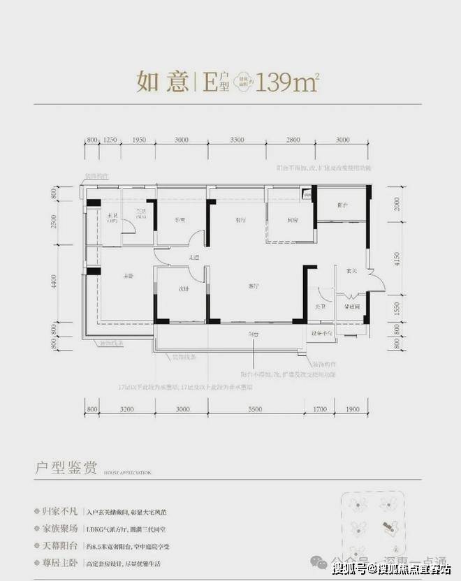 139㎡的4+1房2厅2卫,设计的是竖厅南北通透格局,进门赠送约5.2㎡的入户玄关(不计算在户型图内),客厅5.5米开间,LDKB一体化方厅设计,5个卧室分别做到了主卧27.56㎡/次卧10.2m²/次卧9.9㎡/次卧9.9㎡/次卧4.46m²(包含墙体飘窗),L型厨房,得房率约81%(不含赠送),客厅连接次卧出13.6m²的观景大阳台,主朝西南向。套内面积112.59m²+赠送面积31.98m²=实际使用面积144.57m²,加上赠送后得房率约104.01%。
