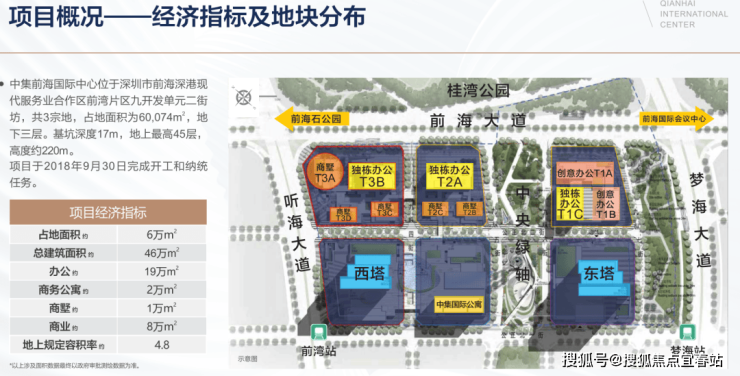 作为前海前湾片区的地标建筑之一,中集前海国际中心项目占地面积约6.01万平方米,总建筑面积接近50万平方米,总投资约100亿元,属于双地铁上盖低密度生态产城融合综合体,业态包含塔楼办公(东塔高约220米,西塔高约180米)、独栋办公、创意办公、国际公寓、集中商业等。