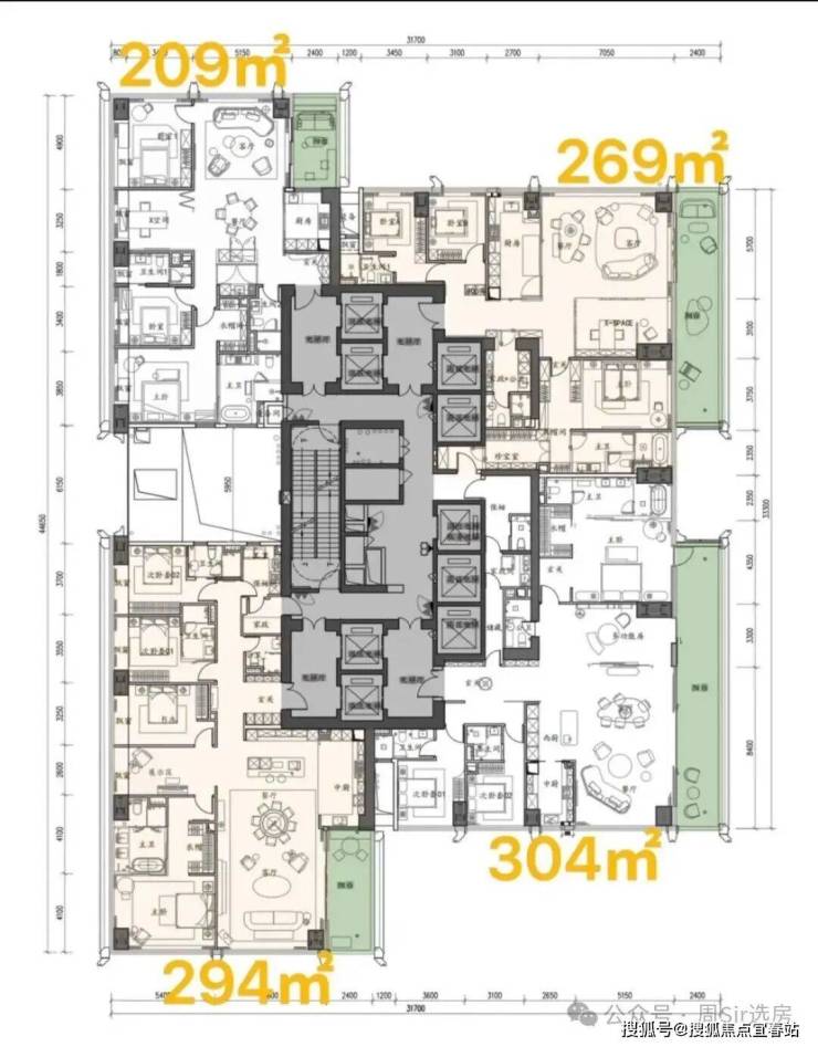 【户型面积】低区209-294-269-304㎡,高区370-375-403㎡,超高区500平-700平-1050㎡