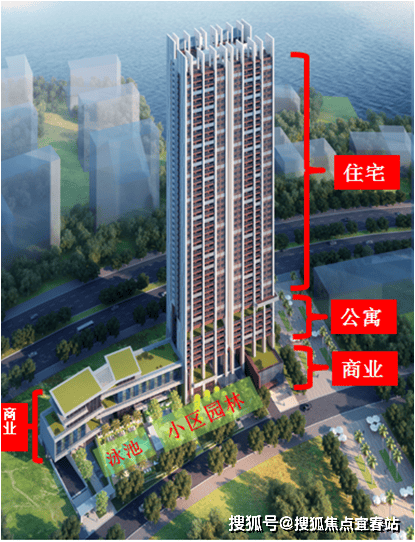 产品方面:项目按照南站的整体规划,总高度160米,由一栋51层高的塔楼和一层5层高的裙楼组成,项目塔楼的一、二层以及裙楼部份为商业,三层和九层是空中花园,四层至八层为公寓,十层至五十一层为住宅,其中二十层和三十六层为避难层,共320户。