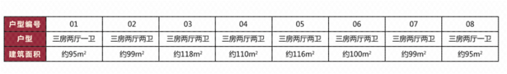 目前项目对外推出01、02、03、04、05、08单元,面积为95-118平的主流刚需及首改产品,均有面积赠送。产品为三房设计,其中02-04单元为三房两厅两卫,01单元为三房两厅一卫设计,户户方正实用,均带超大景观阳台。