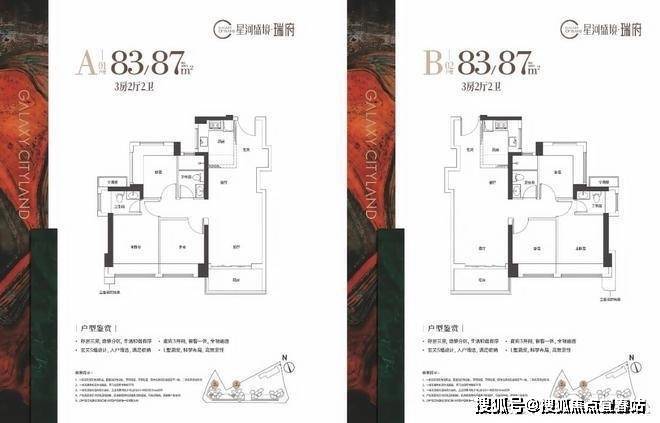83-87㎡的3房2厅2卫,设计的是经典竖厅格局,三开间朝南,3个卧室,得房率约95%(含赠送),西南朝向。