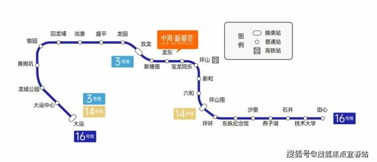 地铁配套:中海新都荟,家门口就是16号地铁线“龙东站”,该线路是起自坪山田心,开往龙岗大运枢纽的普线,2站可到坪山高铁站,11站到大运站可换乘3/14号线。