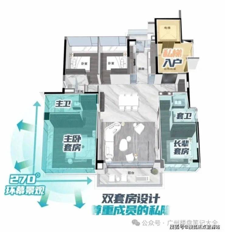 • 330㎡:端厅设计,270°江景视野,主卧配备270°飘窗,奢享私密性。