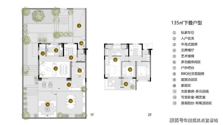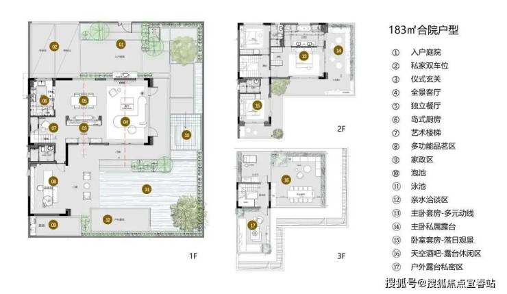 135㎡叠拼2+1户型,端部拼接183㎡合院户型,由入院到入宅,以景观渗透与空间共生为核心。以LDK+庭院的空间组织弱化界定,提升空间的通透感和互动性;度假观景主卧套房为标准配置,搭配豪华卫浴与私属露台,兼具私密质感和观景体验,多元化动线组织,让生活随心而动。