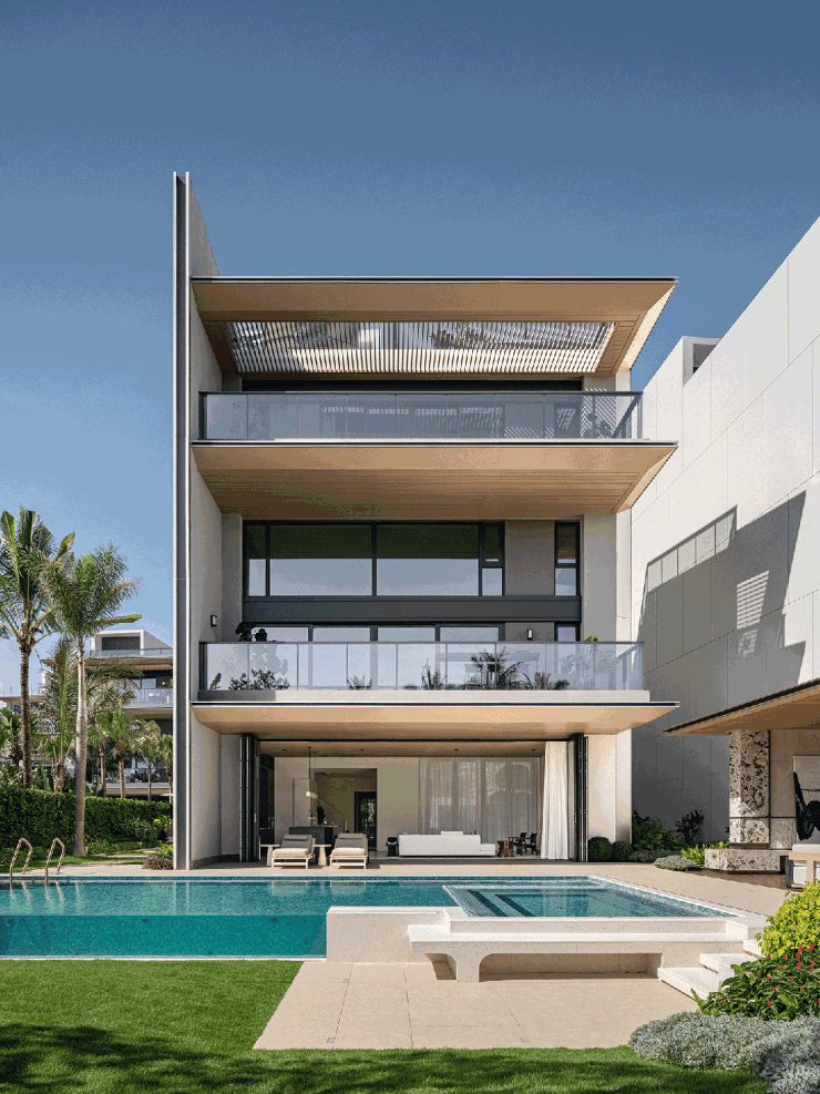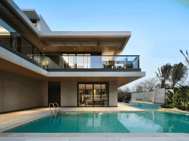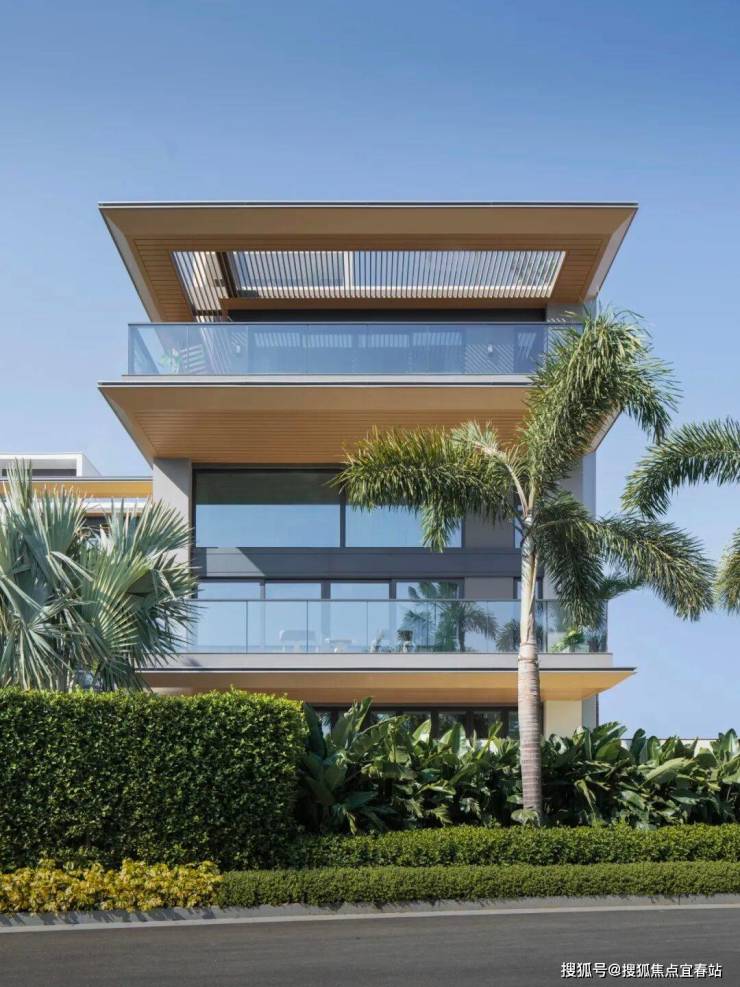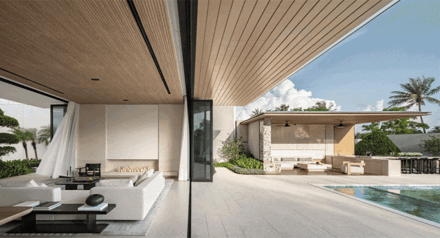 立面采用大面积玻璃与仿木纹铝板的黄金组合:全景舱式超大玻璃将室外山海、绿植、蓝天最大限度引入室内,让居住空间与自然无缝衔接;仿木纹铝板自带温润柔和的肌理,与碧海蓝天相映成趣,完美诠释现代松弛的国际滨海度假风情。通过对尺度比例的精准把控,最终凝练出极简纯粹的现代风格,让建筑既显挺拔规整,又不失轻盈通透的质感。
