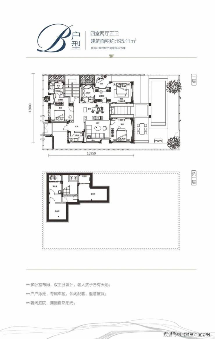 B户型规划面积约195㎡,实得约355㎡,院子约140-240㎡