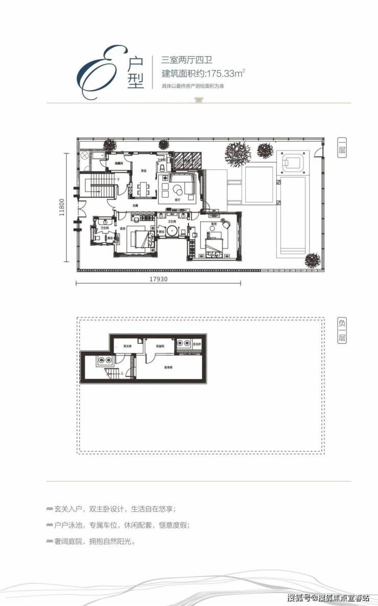 E户型规划面积约175㎡,实得约286㎡,院子190-480㎡
