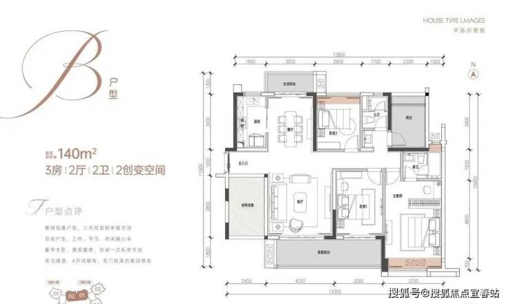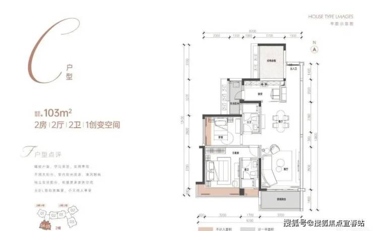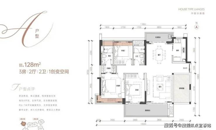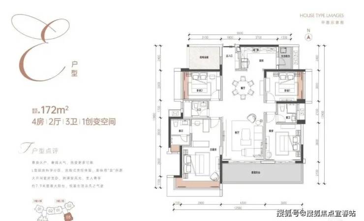 客餐厅等宽相连,开间达到3.8米,景观阳台为I型,长达6米,连通其中一间次卧。