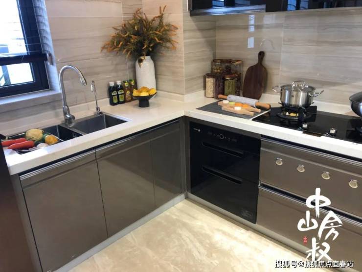 厨房位于餐厅旁,操作台同样是L型布局,预留有冰箱位,动线流畅。