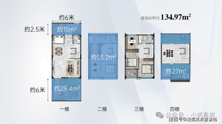 可拓展空间极大,可实现3+1层高拓空间,以4#4 45号房为例,建筑面积约135.23㎡,总拓展约125㎡(其中室内55.2㎡、前后花园45㎡、南北露台24.63㎡),拓展率超过92%。(下图蓝色区域为拓展空间示意)