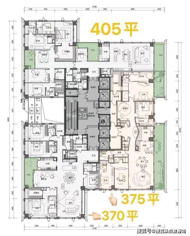 ②高区42F起(150-200米)是约370-375-403㎡4+1房五卫+家庭厅+家政套间;