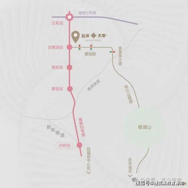 远洋天萃家门口就是“福田专线”——10号地铁线“光雅园站”B出口,1站到五和枢纽站,可换乘5号地铁线/深大城际,3站可到龙华深圳北站,3站到福田、4站到南山。