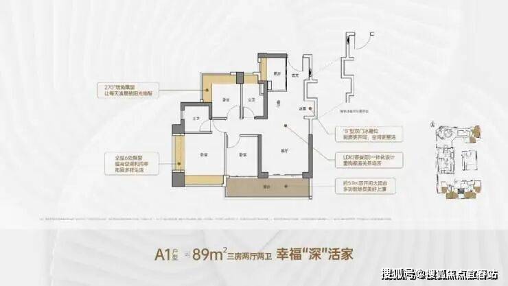 89㎡的3房2厅2卫,A1户型,设计的是竖厅格局,客厅3.5米开间,LDKB一体化,S墙设计预留冰箱卡槽位,客厅连接次卧出5.9米长的大阳台,主卧双面飘窗,次卧270度转角飘窗,U型厨房,卫生间干湿分离,阳台有朝西向、东向、南向。