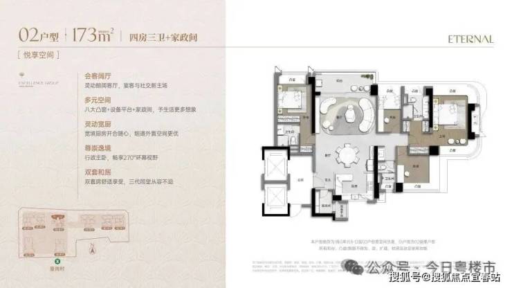 :朝北可观市民中心及莲花山景观,配备环幕尊奢主卧、独立衣帽间及三卫浴,双电梯独立入户设计保障了私密性,满足多代同堂或高端社交需求。