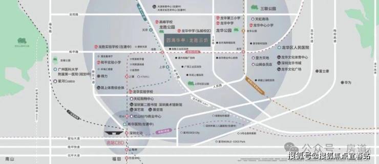 • 百年高峰学校(龙华区公立四大、十大录取率排名前三)、龙华中学弘毅校区(广东省一级)、龙华中学中心校区(广东省一级)、龙华第三小学(公办32班小学)、项目配建幼儿园等
