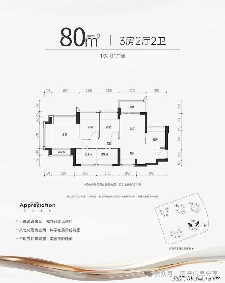 新规户型,得房率最高达104%,75平就可以做3房2卫,远优于片区其它项目,鸿荣源观城、合正观澜汇都是88平三房。