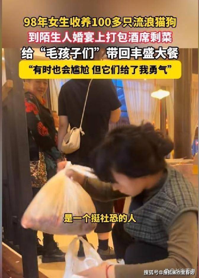 想到这个办法后,她就开始去婚宴打包剩菜了。宣宣本来有点害羞,但是为了猫咪们能吃饱,她就主动走到那些不认识的新人面前,然后说出自己的想法。通常呢,新人们都能理解她,也支持她。有的人甚至会很热情地请她坐下来一起吃。不过她都会很有礼貌地拒绝,但是她会在礼金簿上放个100块钱左右。她笑着说,这是“小猫小狗交的饭钱”。我觉得这个细节特别暖心,也体现了她对新人的尊重。