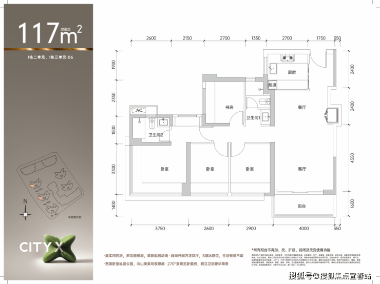 全明设计大景观视野,约3.6米开间宽活阳台;全南向客厅及卧室,主卧270°宽景采光