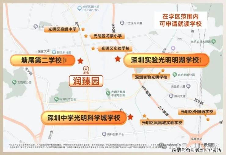 社区内配置幼儿园,西北侧地块为九年一贯制学校(规划中),与项目一路之隔。规划3所九年一贯制学校、其中一期学校[深圳实验光明明湖学校]2025年9月已开学(信息源自深圳光明学校公众号),项目3公里范围内涵盖[深圳中学光明科学城学校]、[深圳市光明实验学校]等。
