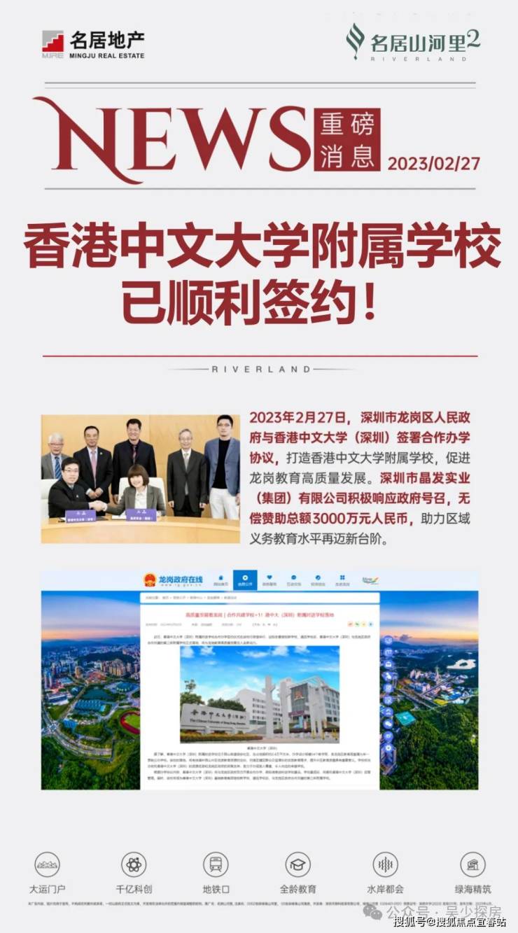 名居山河里自带1所18班制幼儿园,家门口的香港中文大学(深圳)附属时进学校,该校是1所九年制公办学校,规划有54个教学班,也是香港中文大学(深圳)基础教育集团继大运的道远学校、知新学校之后,与龙岗区政府合作共建的第三所附属学校,在2023年的2月27日上午,香港中文大学(深圳)附属时进学校与龙岗区政府正式进行了合作办学签约仪式。
