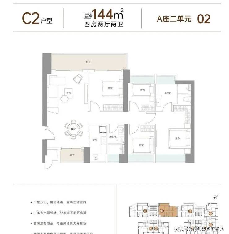 1栋A座二单元四梯四户约125-144㎡3-4房,户型方正·超大观景阳台,近一比一梯户比,层高3.15米,中轴之上,做独享者,悦享尊贵生活体验。