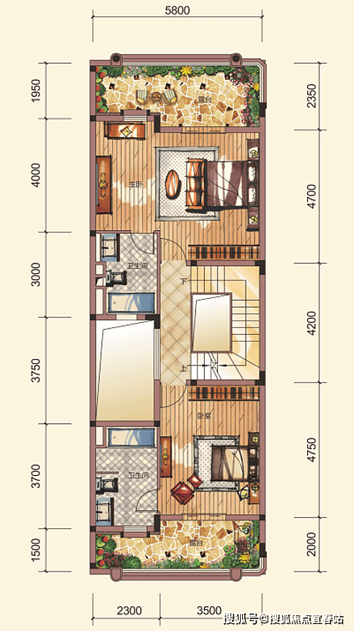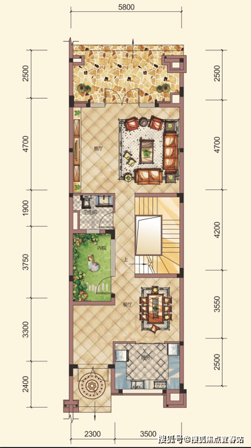 C2户型,联排别墅,5房2厅4卫,三庭院设计,5.4米开间,3.8米高大客厅,煊赫贵族气度。