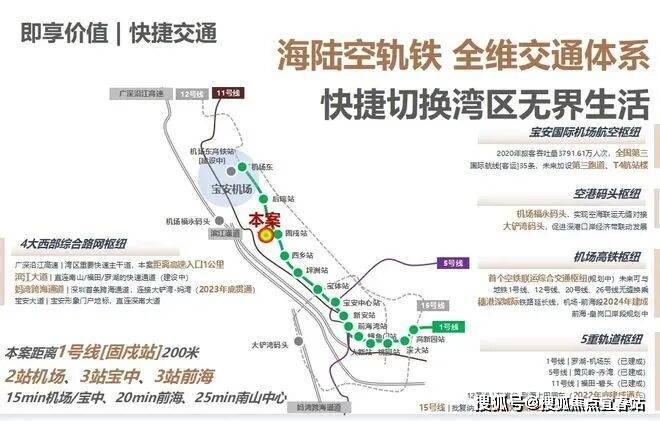 交通状况:项目距离1号线固戍站约200米,步行距离约600米(约9分钟),往南4站可达宝安中心,6站可达前海核心区,去南山、福田、罗湖片区都很方便。此外,项目周边还有多条公交线路,交通出行便捷。
