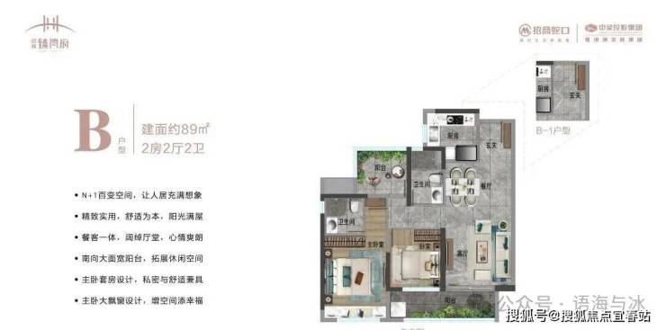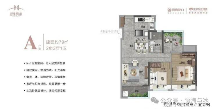 79㎡2+1房:3开间朝南,主卧带飘窗,N+1空间可改造为书房或儿童房,适合年轻家庭。