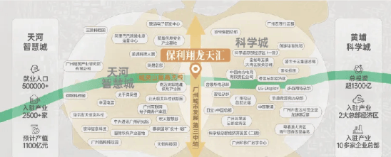 项目占位广州第三发展轴“科技创新轴”,北接中新广州知识城、南抵大学城,以琶洲为核心,汇聚高端产业,未来承载GDP超1万亿元。西侧天河智慧城(广州“硅谷”)已进驻网易等2500家企业,东侧黄埔科学城新兴产业产值占全市50%以上。黄陂板块主打纯粹居住功能,承接天河外溢需求,兼具价差优势,成为自住优选。