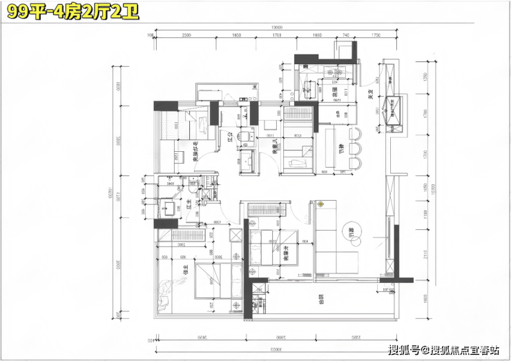 99㎡的4房2厅2卫,设计的是竖厅格局,客厅3.35米开间,LDKB一体化,S墙设计预留双开门冰箱卡槽位,三开间朝南,动静分区,分别做到了主卧15.26㎡/次卧9.57㎡/次卧6.96m²/次卧6.96㎡(包含墙体飘窗),U型厨房,公卫三段式干湿分离,赠送设备平台,得房率约78.27%(不含赠送),客厅连接次卧出9.37m²大阳台西南或东南朝向。靓点:99平做到了4房2卫,主卧270°无柱转角飘窗,厨房烟道外置+额外赠送设备平台,并且是纯南向格局。