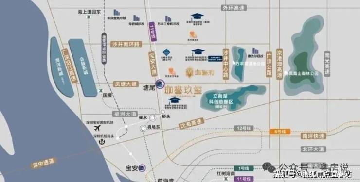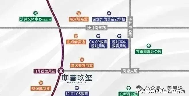 项目位于沙井新桥,珈誉府本身是一个大型综合体,自身配套丰富,自带50万㎡大型商业;地铁11号线塘尾站挨着项目,深圳外国语宝安学校在项目南北两侧,且靠近万丰湖、立新湖,有生态资源。
