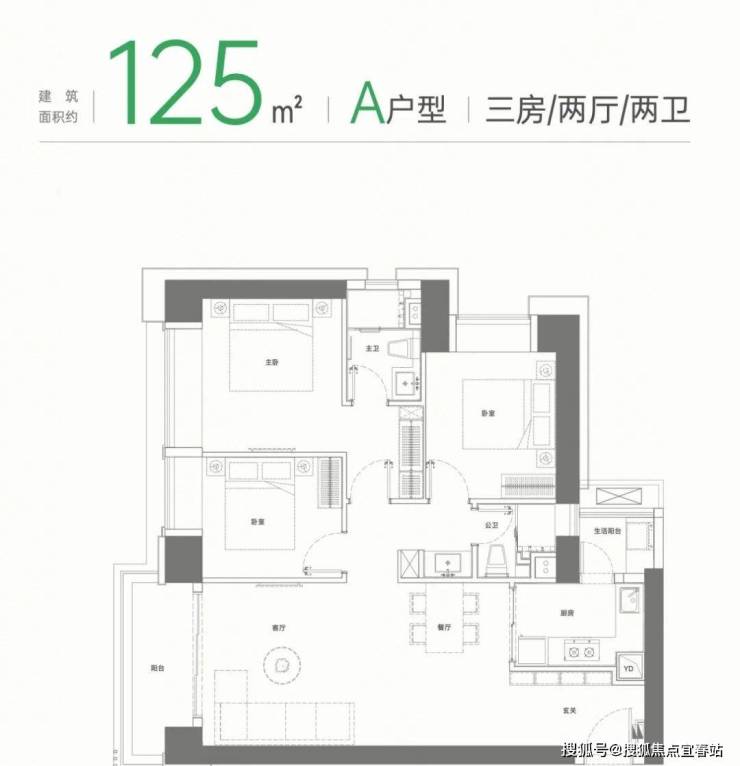 125平三房两卫A户型这是项目最主力的户型,总共646套。这个户型有很多不同朝向,但都在端头位,正向和侧向均有采光,且入户左转入玄关,增加了隐私性的同时,还会有一种豁然开朗之感。
