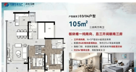 105㎡三房两厅两卫户型,三开间朝南,约 3.9m 的大开间竖厅设计,动静分离,保障了居住的舒适性。双阳台设计可观赏一线园景和山景,且空间布局合理,满足了刚需和改善型客户对于实用三房的需求。同时,项目以智能健康精装交付,配置全屋新风系统、净水系统等,从细节处打造智慧家居。