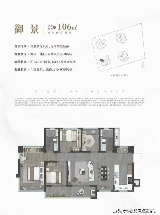 106㎡的4房2厅2卫,设计的是横厅南北通透格局,客餐厅开间5.6米,餐厨一体化,约13.7米超幕视野,超长阳台,主卧转角270°大飘窗,只有2栋07户型才有,得房率:78.99%(不含赠送),阳台主朝西南向。