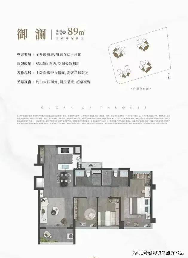 89㎡的3房2厅2卫,设计的是新版竖厅格局,客厅开间3.5米,LDKB一体化,S墙设计预留冰箱位,约11米四面宽超幕视野,主卧套房带衣帽间,U型全开敞厨房,得房率:78.99%(不含赠送),有西北、西南、东北、东南4个朝向。