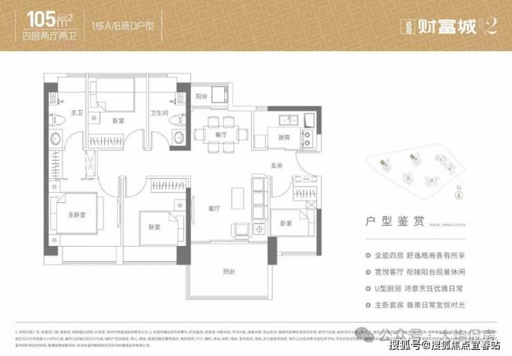 105㎡的4房2厅2卫,设计的是竖厅南北通透格局,客厅3.5米开间,全屋飘窗双阳台设计,4个卧室分别是3.25/2.85/2.6/2.1米的宽度,U型厨房,得房率:86.47%(包含赠送),阳台主朝西南向。
