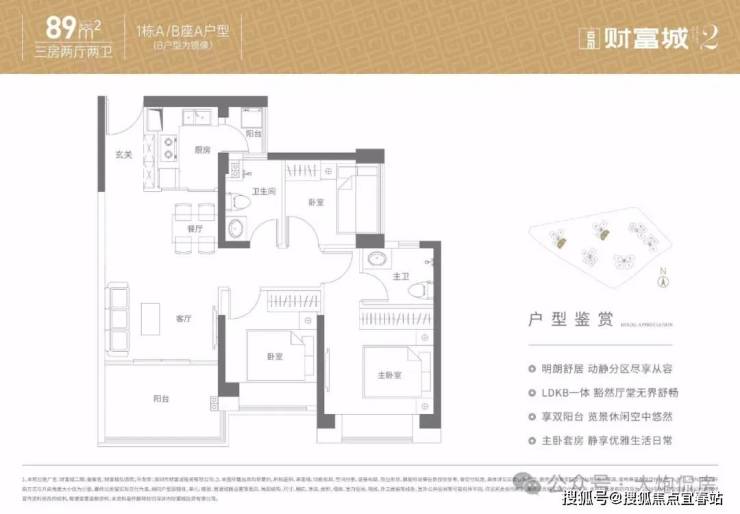 89㎡的3房2厅2卫,设计的是经典竖厅格局,客厅3.4米开间,3个卧室分别是3.3/2.8/2.5米的宽度,L型厨房,带1个小生活阳台,得房率:86.13%(包含赠送),西南、东南及东北朝向。