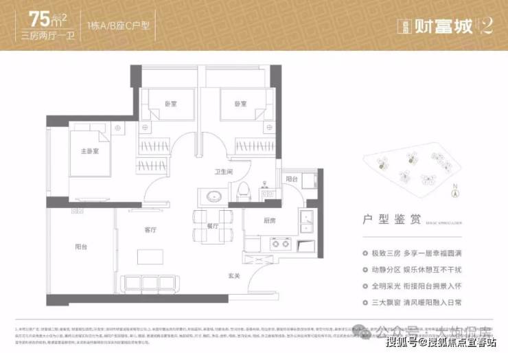 75㎡的3房2厅1卫,设计的是竖厅格局,客厅3.35米开间,3个卧室分别是3.1/2.85/2.25米的宽度,L型厨房,带1个小生活阳台,卫生间三段式分离设计,得房率:91.52%(包含赠送),西南及西北朝向。
