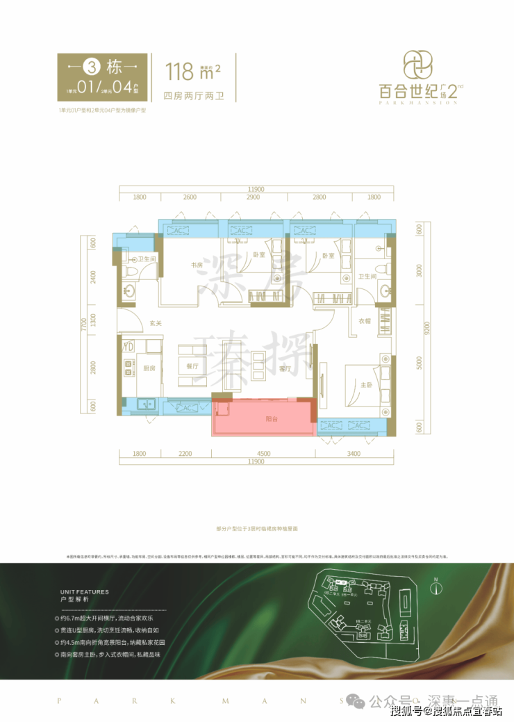118㎡的4房2厅2卫,3栋1单元01/3栋2单元04户型,设计的是横厅南北通透格局,进门入户玄关,客餐厅6.7米开间,LDKB一体化设计,四开间朝南,4个卧室分别做到了主卧19.04㎡/次卧10.44㎡/次卧10.08㎡/次卧9.36㎡(包含墙体飘窗),U型厨房,卫生间干湿分离,得房率约76.2%(不含赠送),阳台主朝正南向。套内面积89.86㎡+赠送15.06㎡=实得104.92㎡,加上赠送得房率约89.98%。