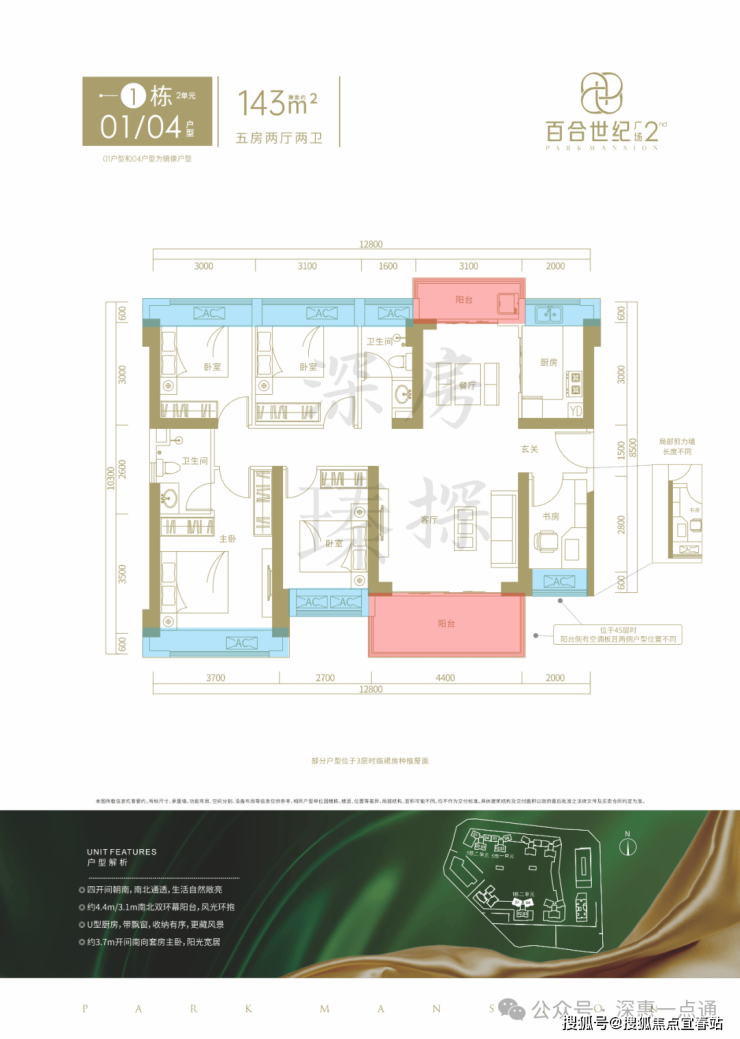 143㎡的5房2厅2卫,3栋1单元04/3栋2单元01户型,设计的是竖厅南北通透格局,进门入户玄关,客厅4.4米开间,客餐厅分离设计,南北双阳台,四开间朝南,4个卧室分别做到了主卧17.77㎡/次卧11.16㎡/次卧10.8㎡/次卧10.8㎡/次卧6.8㎡(包含墙体飘窗),U型厨房,卫生间干湿分离,得房率约76.9%(不含赠送),阳台主朝西南或东南向。套内面积109.52㎡+赠送17.22㎡=实得126.74㎡,加上赠送得房率约88.94%。