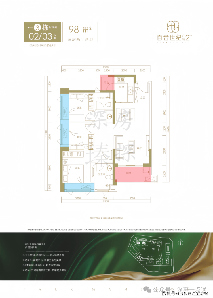 98㎡的3房2厅2卫,3栋02/03户型,设计的是竖厅格局,进门入户玄关客厅3.5米开间,LDKB一体化设计,三开间朝南,动静分区,3个卧室分别做到了主卧14.46㎡/次卧9.6㎡/次卧8.32㎡(包含墙体飘窗),L型厨房带1个生活阳台,公卫三段式干湿分离,得房率约76.2%(不含赠送),正南朝向。套内面积74.69㎡+赠送9.05㎡=实得83.74㎡,加上赠送得房率约85.46%。