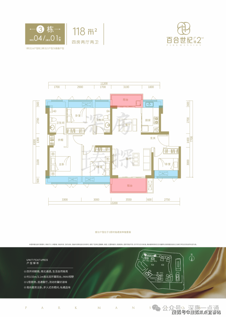 118㎡的4房2厅2卫,3栋1单元04/3栋2单元01户型,设计的是竖厅南北通透格局,进门入户玄关,客厅4.15米开间,客餐厅分离设计,南北双阳台,四开间朝南,4个卧室分别做到了主卧16.5㎡/次卧11.1㎡/次卧9.57㎡/次卧8.25㎡(包含墙体飘窗),U型厨房,卫生间干湿分离,得房率约76.2%(不含赠送),阳台主朝西南或东南向。套内面积89.55㎡+赠送15.44㎡=104.99㎡,加上赠送得房率约89.37%。