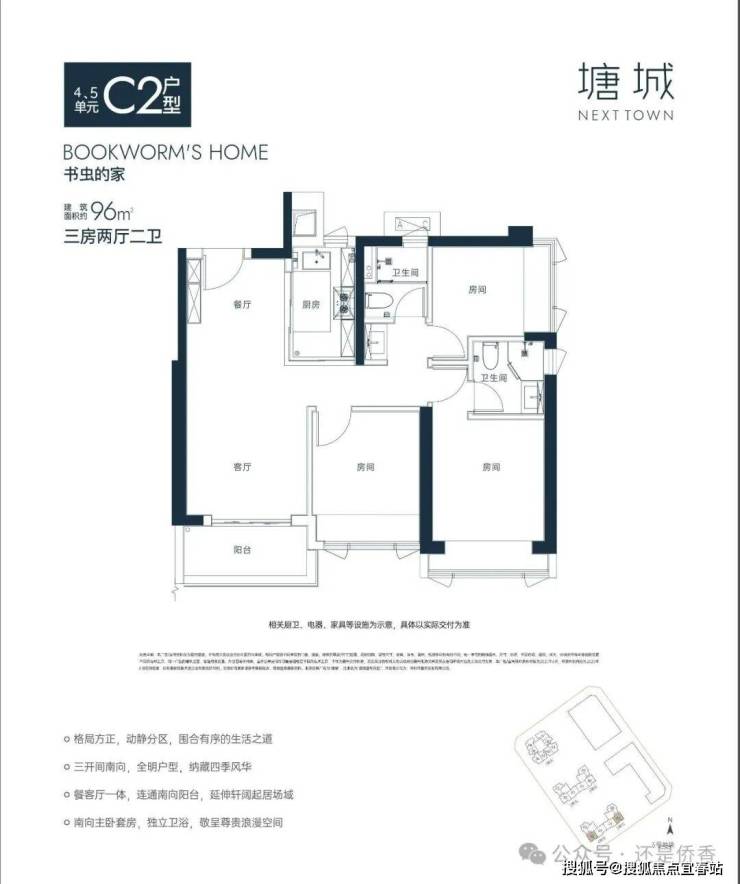 【C2户型96㎡三房两厅两卫】“方正全明南向三房”,格局方正,围合设计